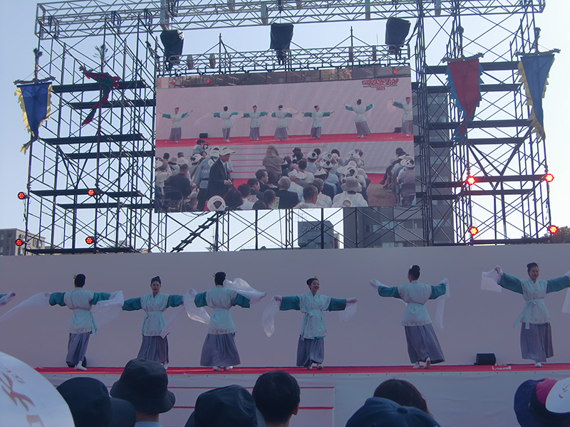 2023年11月5日(日)四天王寺ワッソが開催されました。当初は大阪の主要道路である谷町筋を北から南へ、四天王寺までの道のりを古代朝鮮半島の衣装をまとい、巨大な舟を模しただんじりや輿に乗って巡行する祭りとしてスタートしましたが、近年はイベントの内容も変更されてきて、今年は徒歩での巡行もなくなり、ステージのみの開催となりました。プレステージでは高校生を中心とするダンスや和太鼓の演奏で会場の雰囲気を盛り上げ、また第2部のステージでは韓国釜山国楽院による「嶺南地域の太鼓遊び」等若い力が溢れた演技や演奏が力強く魅力的でした。